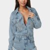 Trendy denim jacket with corset-style lace-up, long sleeves, and metal snap front. An edgy addition to any casual outfit or layered look.