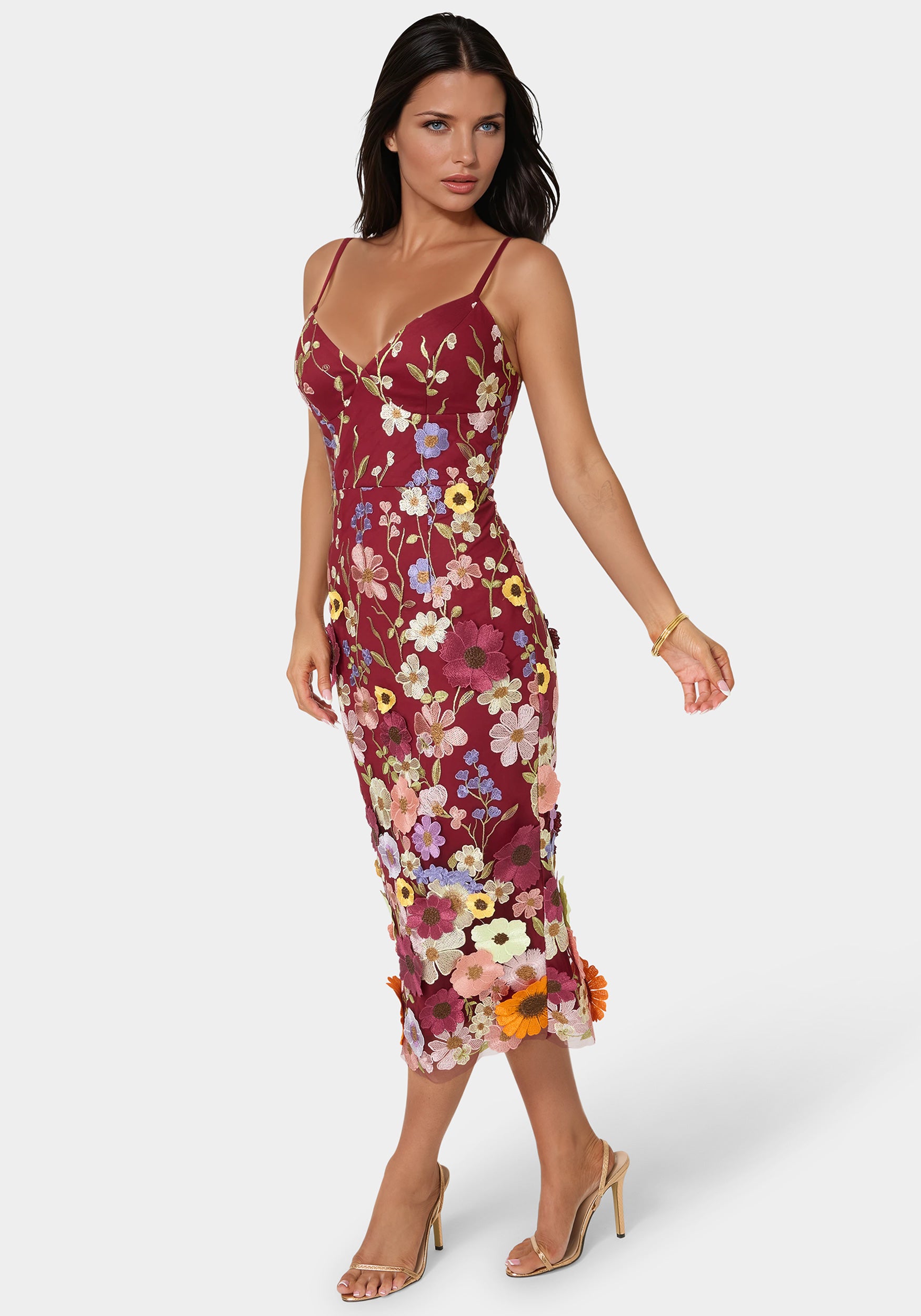 V-neck midi adorned with playful 3D flowers and a strappy design; ideal for outdoor celebrations or garden parties.