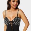 Shine after dark in this bold romper. Sparkling beads and sequins catch every light while rhinestone straps create edgy appeal and the adjustable lace-up front ensures perfect fit.