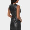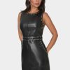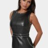 A sleeveless faux leather mini with bold studded seams; great for making a statement at urban events or mixers.