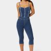 Show off your curves with the fitted Capri denim jumpsuit. Perfect for a casual night out or daytime errands, its sleek design and Capri length offer a flattering and versatile fit.