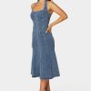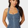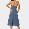 Show off your style with the halter front zipper midi denim dress. Perfect for concerts or a night out, its edgy halter design and functional zipper detail offer a modern twist on a classic look.