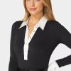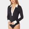 Feel the seamless blend of casual and enticing with the Henley Satin Combo Knit Bodysuit. Wear it under a light cardigan for an art gallery visit or paired with sleek jeans for a look that transitions beautifully from day to night.