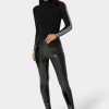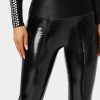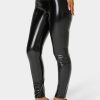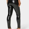 Shiny vegan leather and a high waist create stylish allure; great for bold, urban styles.