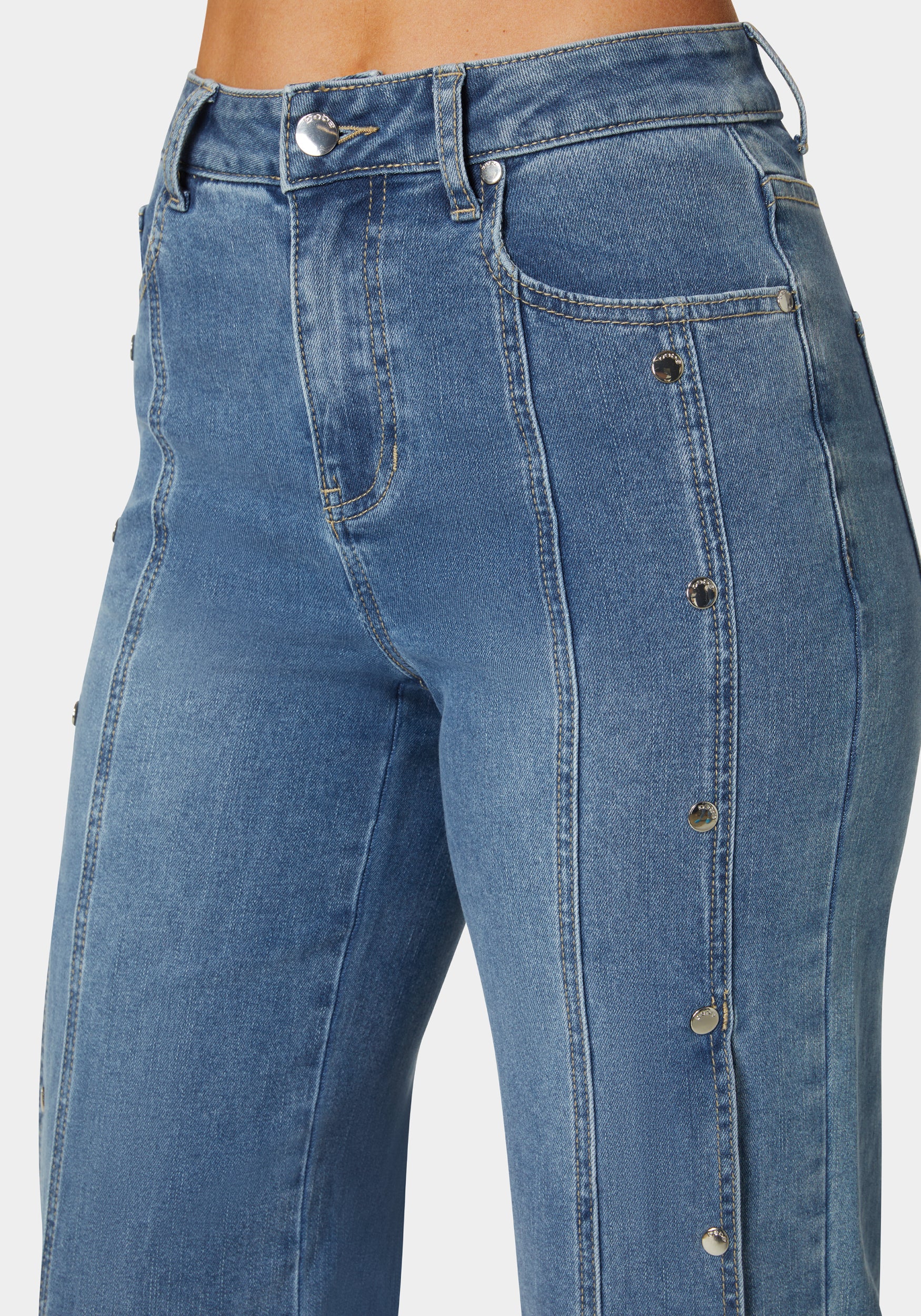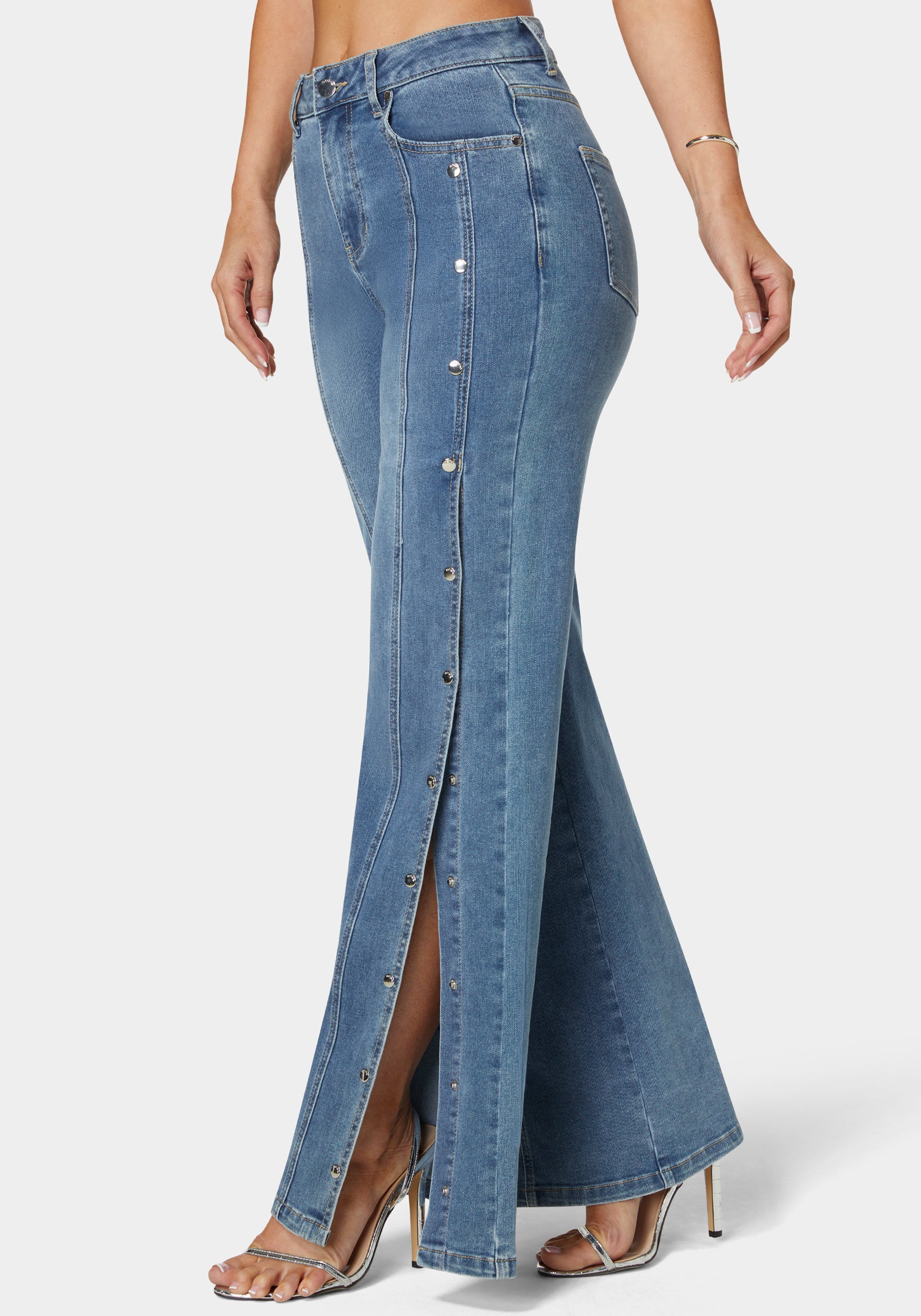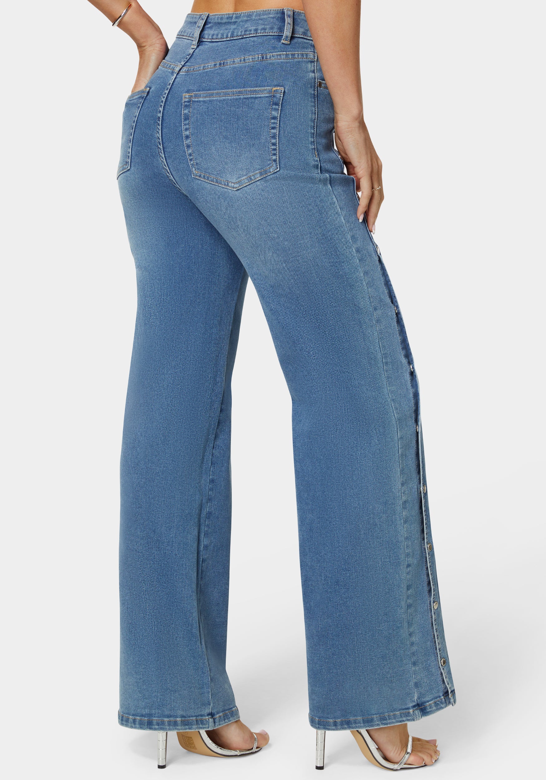 Make a statement with high waist snap detail wide leg jeans. Ideal for casual Fridays or weekend getaways, their unique snap design and flattering cut bring a modern twist to classic denim.