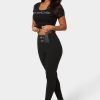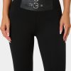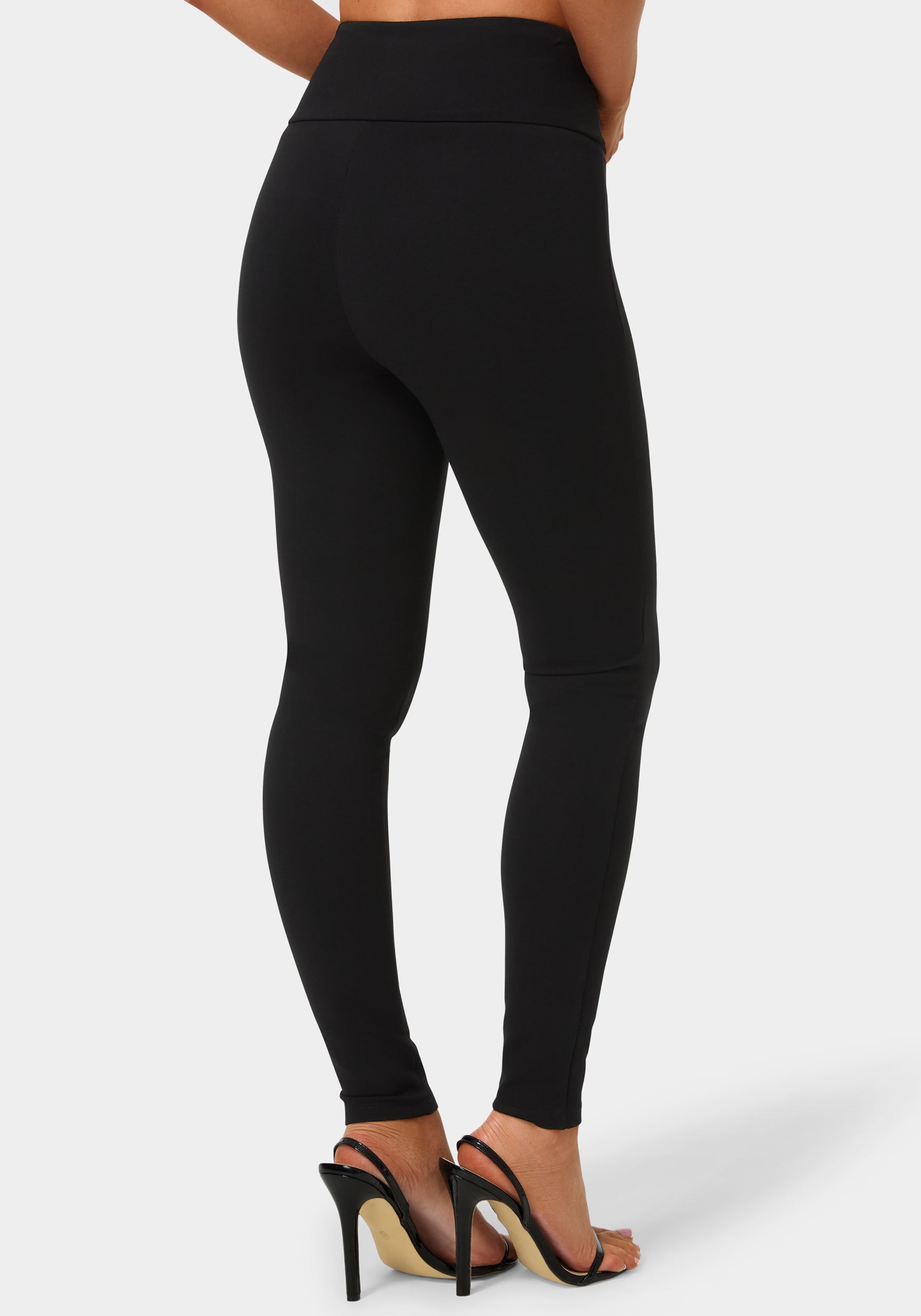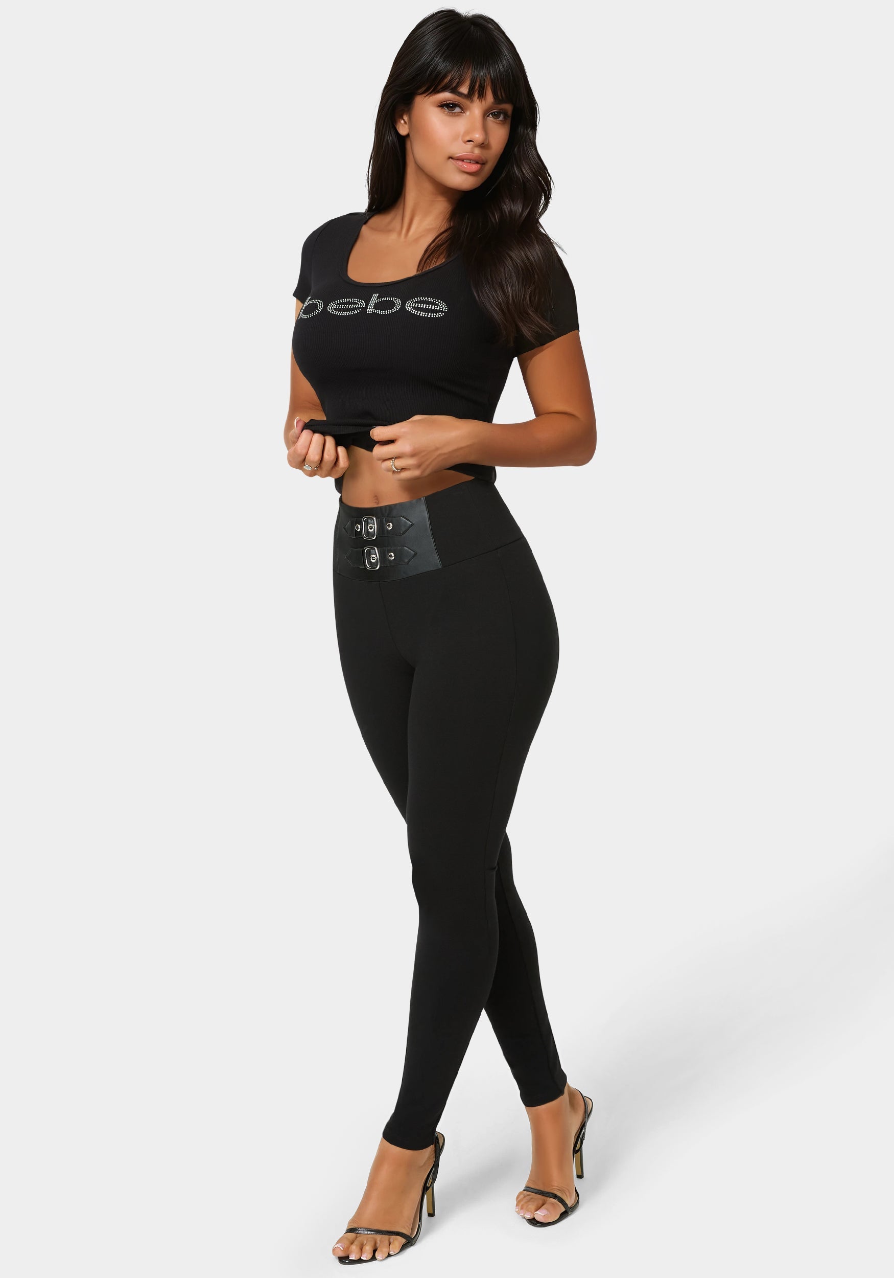 Edgy high waist leggings with a belt detail boast vegan leather shine; perfect for trendy outings.