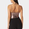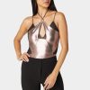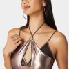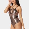 Step into luminous allure with the Metallic Foil Halter Neck Mesh Combo Bodysuit. This piece is a dance between daring and delight, featuring a halter neck that bares with confidence and a metallic foil that catches every eye. Mesh detailing whispers secrets of what’s beneath, making this bodysuit a key to unlocking nights filled with intrigue and empowerment.