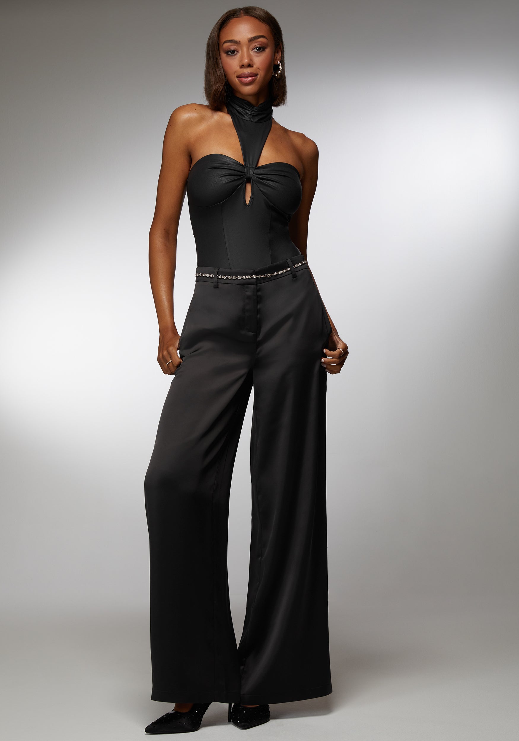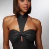 Step into the spotlight with the bebe x Ciara mock neck bodysuit. Embody the night with its striking coated knit that hugs every curve with precision. This bodysuit stands out with its daring halter neckline, ensuring all eyes are on you. Perfect for layering under a blazer or wearing solo, it’s your go-to for making every moment unforgettable. Own your power, own your style, own the night.