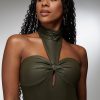 Step into the spotlight with the bebe x Ciara mock neck bodysuit. Embody the night with its striking coated knit that hugs every curve with precision. This bodysuit stands out with its daring halter neckline, ensuring all eyes are on you. Perfect for layering under a blazer or wearing solo, it’s your go-to for making every moment unforgettable. Own your power, own your style, own the night.
