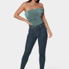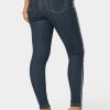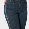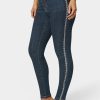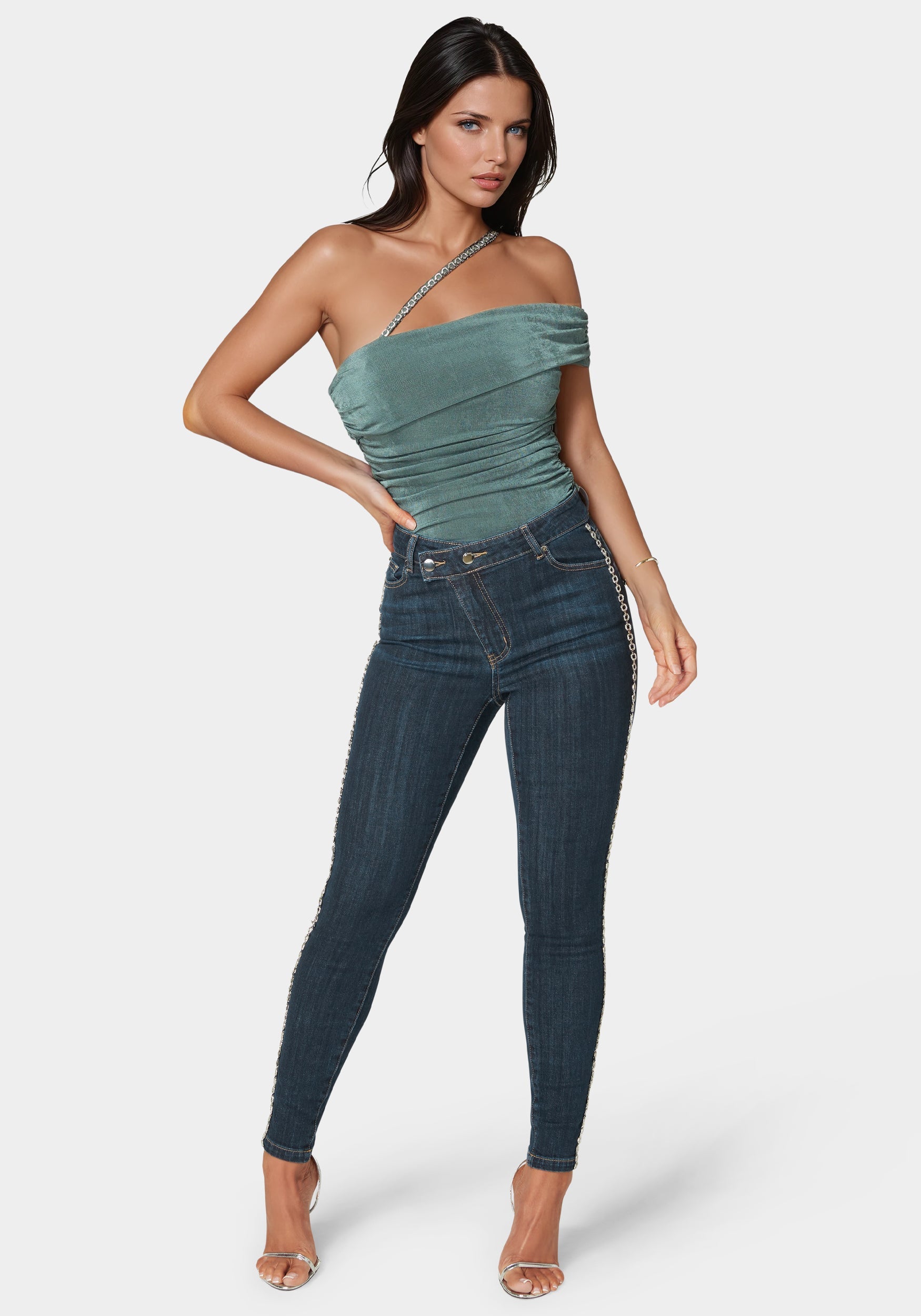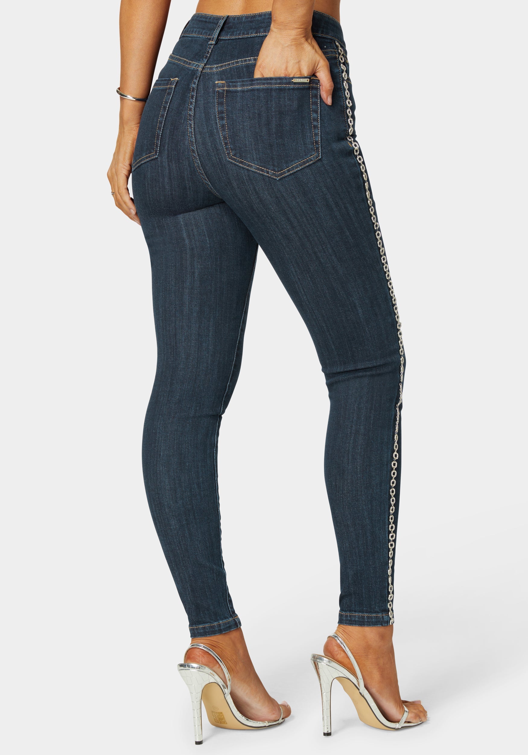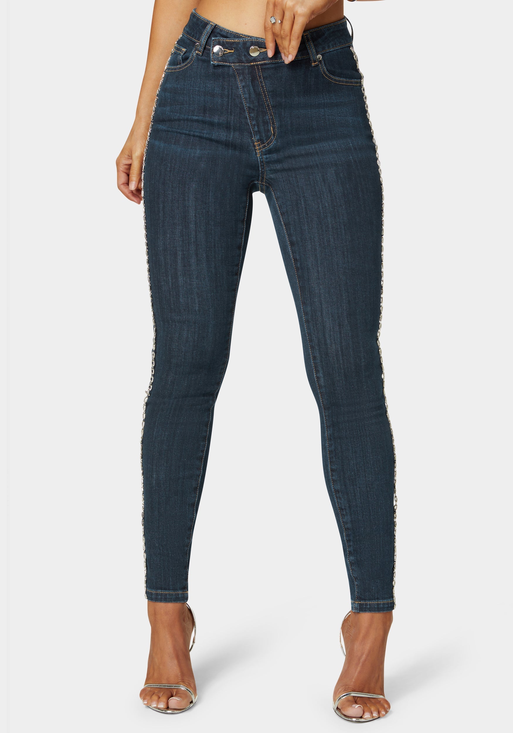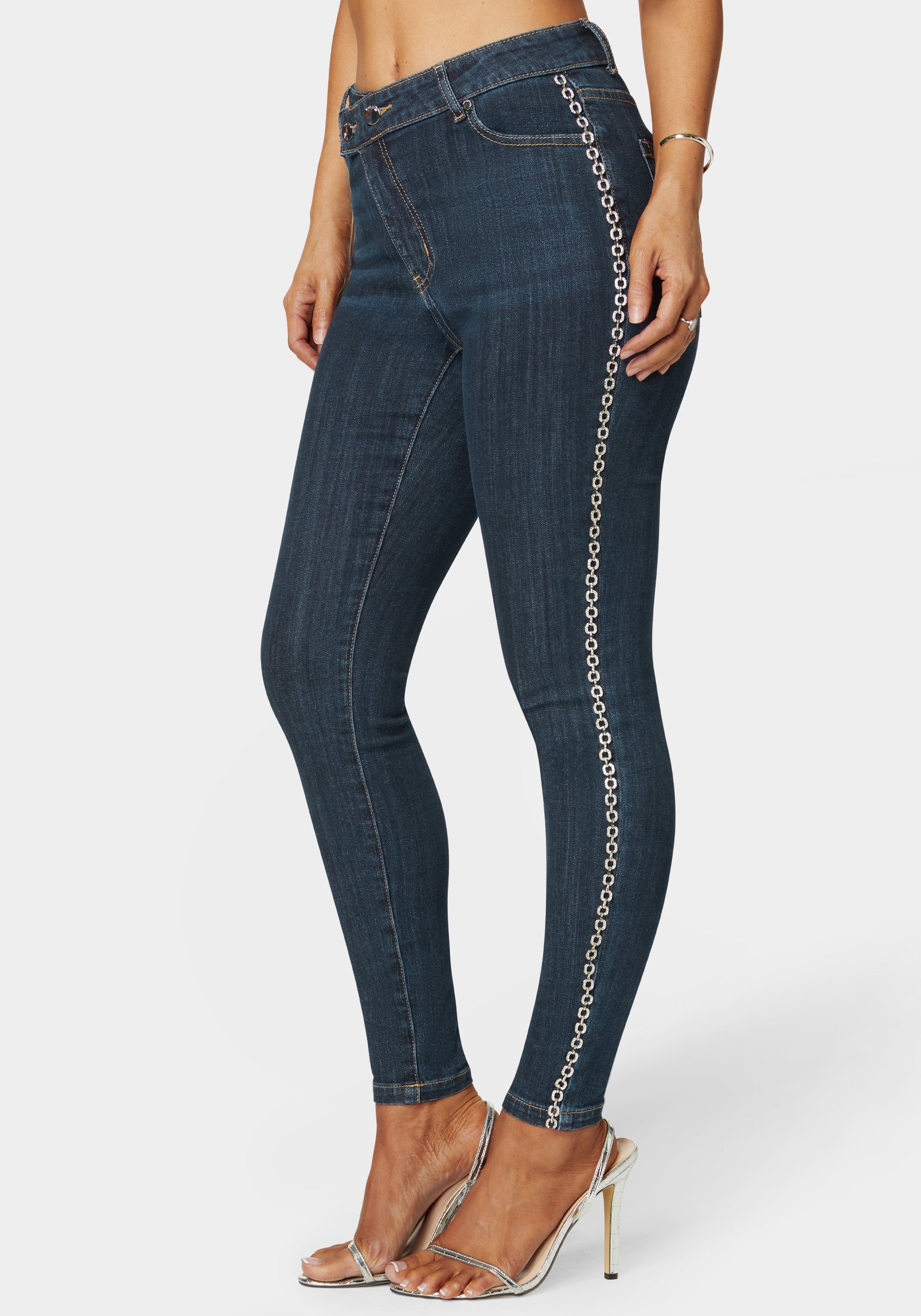 Contemporary skinny jeans with unique chain and rhinestone side detail. A fashionable statement piece for going out or adding sparkle to your daywear.