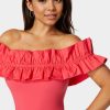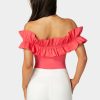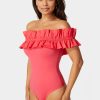 Showcase your flirty side with our Off-Shoulder Poplin Ruffle Knit Bodysuit. The off-shoulder style adds allure, while the ruffle detailing brings a touch of femininity. With a snug knit fabric that hugs your curves, you’ll radiate confidence and captivate hearts wherever you go.