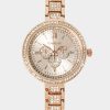 A stylish choice for everyday wear, this rose gold tone bracelet design sparkles with crystals on the bezel and subdials, and clear pavé crystals on the dial.