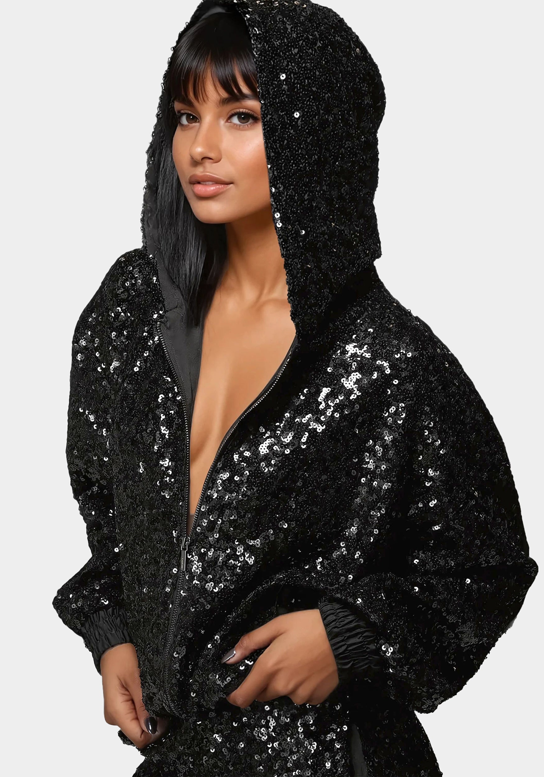 Get ready to shimmer and shake in a hoodie that takes your sparkle to the streets. Adorned with sequins that refuse to be dimmed, this jacket is a collision of comfort and unabashed glam. Perfect for those who carry their own spotlight, it’s your go-to for making everyday life feel like a runway.
