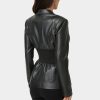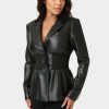 Combining power rib and vegan leather, this blazer offers a refined look for various settings.