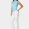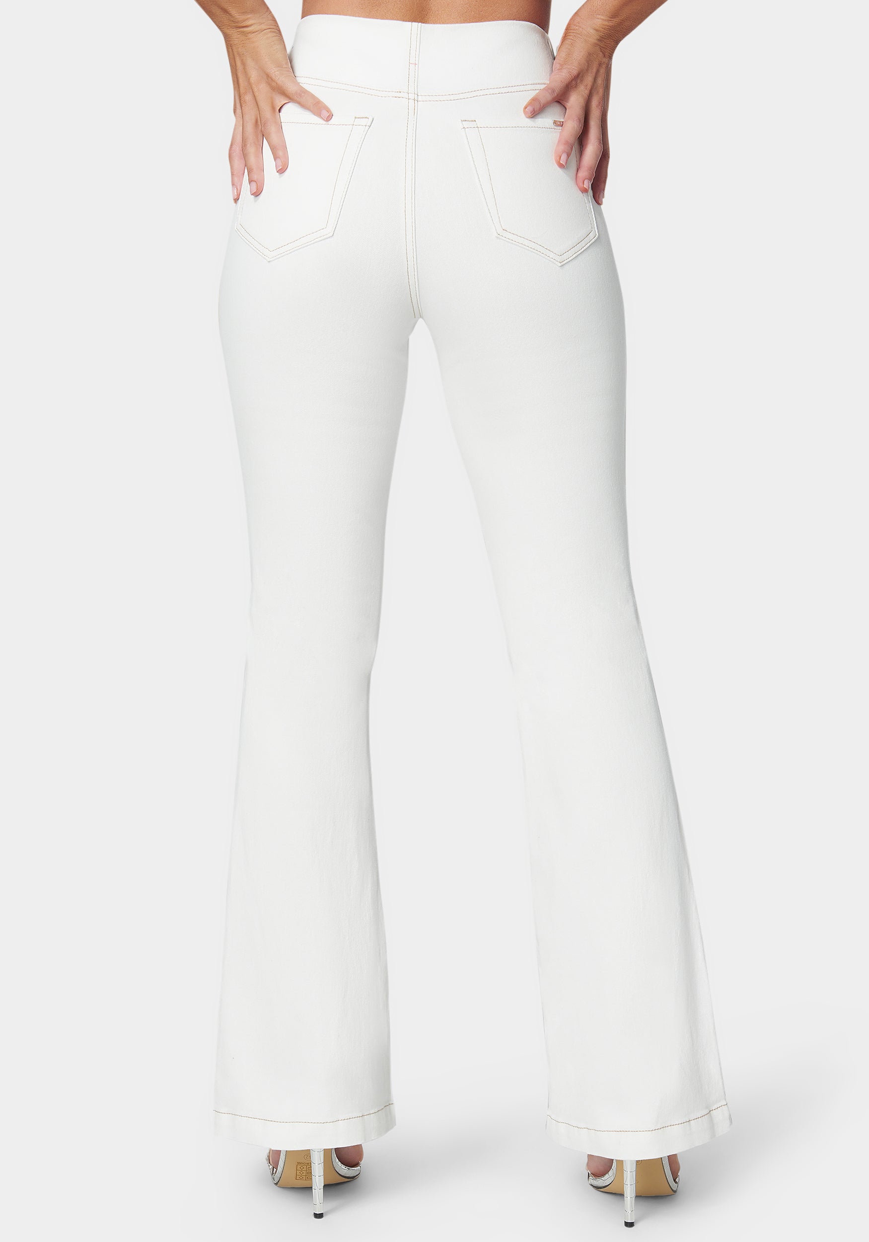 Experience a bold, vintage-inspired look. These white, high-waist jeans feature a flared cut and eye-catching grommet details.