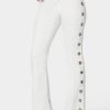 Experience a bold, vintage-inspired look. These white, high-waist jeans feature a flared cut and eye-catching grommet details.