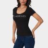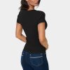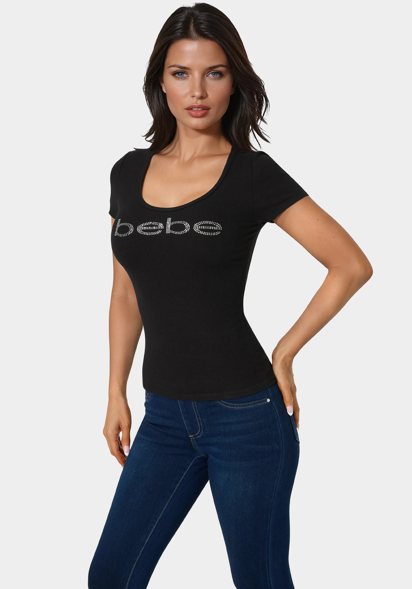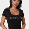 Embrace a minimalist and sultry style with our Bebe Logo Short Sleeve Round Neck Rib Top in Black. The clean white color and ribbed texture create a sleek and sophisticated look, perfect for a chic and effortless outfit.