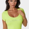 Embrace a minimalist and sultry style with our Bebe Logo Short Sleeve Round Neck Rib Top in Electric Green. The clean white color and ribbed texture create a sleek and sophisticated look, perfect for a chic and effortless outfit.