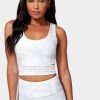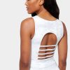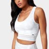 Meet your match! This bold logo tank features an all-over marble print with mesh trim and a laddered cutout back for some edge. Pairs well with the Bebe Logo Legging With Mesh Detail or the Bebe Logo Biker Short.